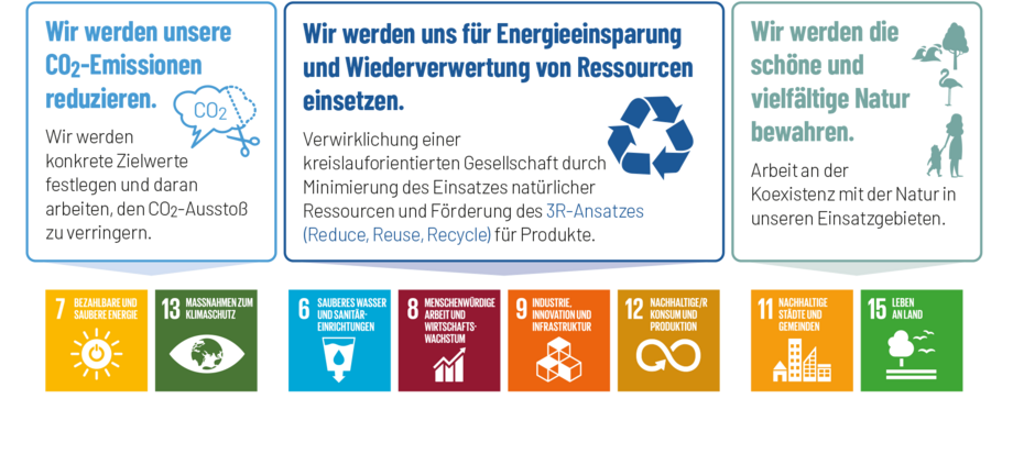 Wir werden im Streben nach Nachhaltigkeit (von Umwelt, Gesellschaft und Wirtschaft) aktiv SDG-orientierte Produkte entwickeln und verbreiten und streben sowohl wirtschaftlichen Nutzen als auch einen Beitrag für Umwelt und Gesellschaft an.
