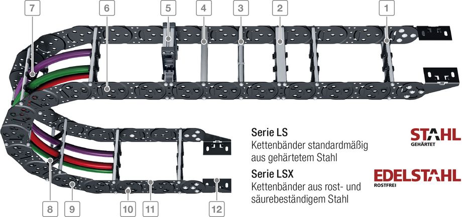 Durch die gewichtsoptimierte Laschenkonstruktion sind die Ketten sehr leicht und dennoch sehr stabil. Die freitragende Länge ist bei der LS-Serie im Vergleich mit Kunststoffketten vergleichbarer Größe deutlich höher.
