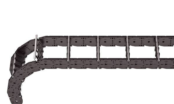 TSUBAKI KABELSCHLEPP löste diese Aufgabe mit der KC0900 mit RS-Stegen aus der Vario-Line, die in den Maschinenmodellen MHL340 G und MHL350 G in unterschiedlichen Breiten und Längen zum Einsatz kommt. Ergänzt wird die hybride Energiekette durch einen Zugentlastungskamm aus der Serie Uniflex Advanced 1665. Das Kürzel RS steht für Rahmensteg Schmal. Die Stege sind aus Aluminium, im 1-mm-Raster verfügbar und lassen sich ohne Schrauben montieren. Die Innenaufteilung kann mit verschiedenen Trennstegsystemen passgenau auf die Vielzahl an Schläuchen und Leitungen zwischen Kabine und Aggregaten abgestimmt werden. Servicepunkte bleiben zugänglich, was Arbeiten am System vereinfacht.