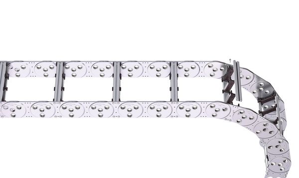 Bei der eingesetzten Stegvariante handelt es sich um einen sogenannten RM-Steg. Dieser massive, beidseitig verschraubte Aluminium-Rahmensteg, eignet sich für starke Belastungen und maximale Kettenbreiten. Der Steg ist kundenindividuell im 1-mm-Raster verfügbar, die Verschraubungen können von außen und innen einfach gelöst werden. Zusätzlich kommt im Innenradius der Energiekette ein Aluminiumsteg auf Basis der Stegvariante LG von TSUBAKI KABELSCHLEPP als Aufbausteg zum Einsatz. Auf diese Weise entstand zusätzlicher Raum, ohne die Breite der Kette zu vergrößern. Die hier eingesetzte Aluminium-Legierung besitzt besonders gute Gleiteigenschaften, was sich positiv auf die Lebensdauer der Leitungen auswirkt.
