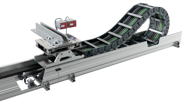 Parallel dazu zeigt TSUBAKI KABELSCHLEPP die Erweiterung seines Condition Monitoring Systems. Neu ist die Möglichkeit, Verschleiß auch außerhalb der Kette zu erfassen, ohne zusätzliche Leitungen in der Energieführung. Sensoren im Führungskanal oder im Mitnehmerschlitten messen den Zustand der Gleitschuhe sowie Schub- und Zugkräfte prozentgenau. Grenzwerte lassen sich anlagenspezifisch definieren und über freie Schaltausgänge in bestehende Steuerungen einbinden.