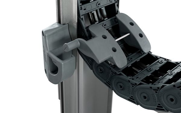 Der TKVG ist für die Energiekette UNIFLEX Advanced 1555 des Herstellers ausgelegt und ab einer Innenbreite von 75 mm sowie einem Krümmungsradius von 125 mm verfügbar. Weitere Serien und Typenreihen können auf Anfrage realisiert werden. Der Anwender profitiert von klaren Optionen bei der Auslegung: Festpunktanschlüsse können links oder rechts gewählt werden. Der Leitungsaustritt am Mitnehmer ist nach vorne oder nach hinten möglich. Montageabstände der Kanalhalter lassen sich flexibel anpassen.