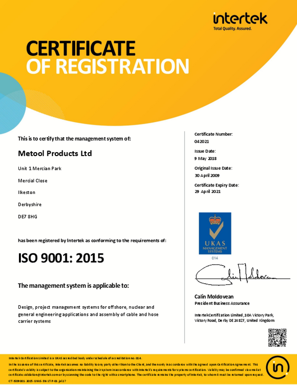 KABELSCHLEPP Metool – Metool Products Ltd. is independently certified by Intertek.